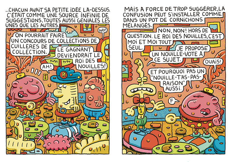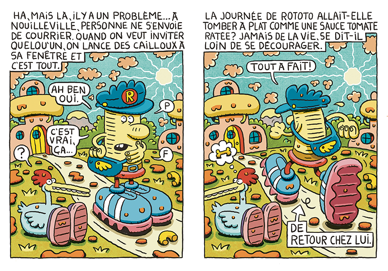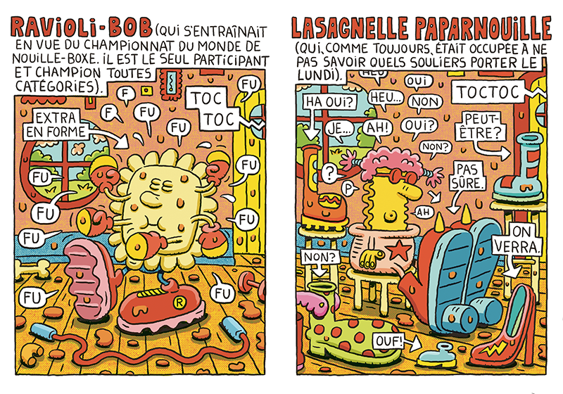 Dans ce premier tome des Histoires de Nouilleville, Richard Écrapou transpose à merveille l’humour déjanté de ses bandes dessinées et fanzines vers la littérature jeunesse. Résultat : une aventure molle, à la sauce tomate, pleine d’absurdité et de tendresse.