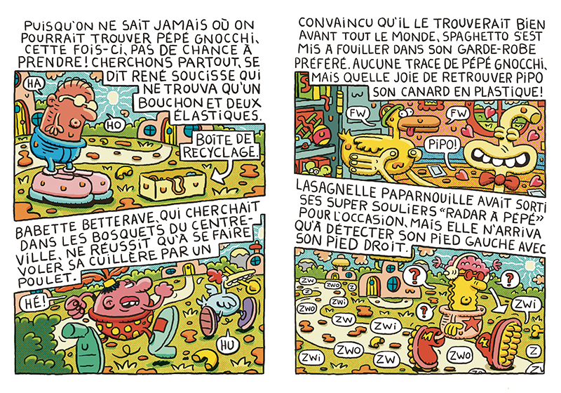 Mais voilà qu’entre deux bouchées de muffin sec, on réalise que Pépé Gnocchi n’est pas là ! Il s’est sûrement endormi quelque part. Il faut vite le retrouver, car tout le monde sait qu’une nouille laissée trop longtemps au soleil… ça peut être désastreux !