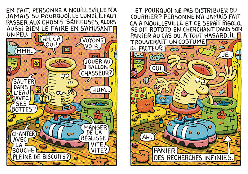 C’est lundi à Nouilleville, et le lundi, on passe aux choses sérieuses! C’est pour cette raison que Rototo décide de fonder le Club des nouilles. Une fois les invitations livrées, tous ses amis le rejoignent au café du coin pas de coin pour… heu… eh bien, on ne sait pas encore à quoi sert vraiment un club de nouilles.